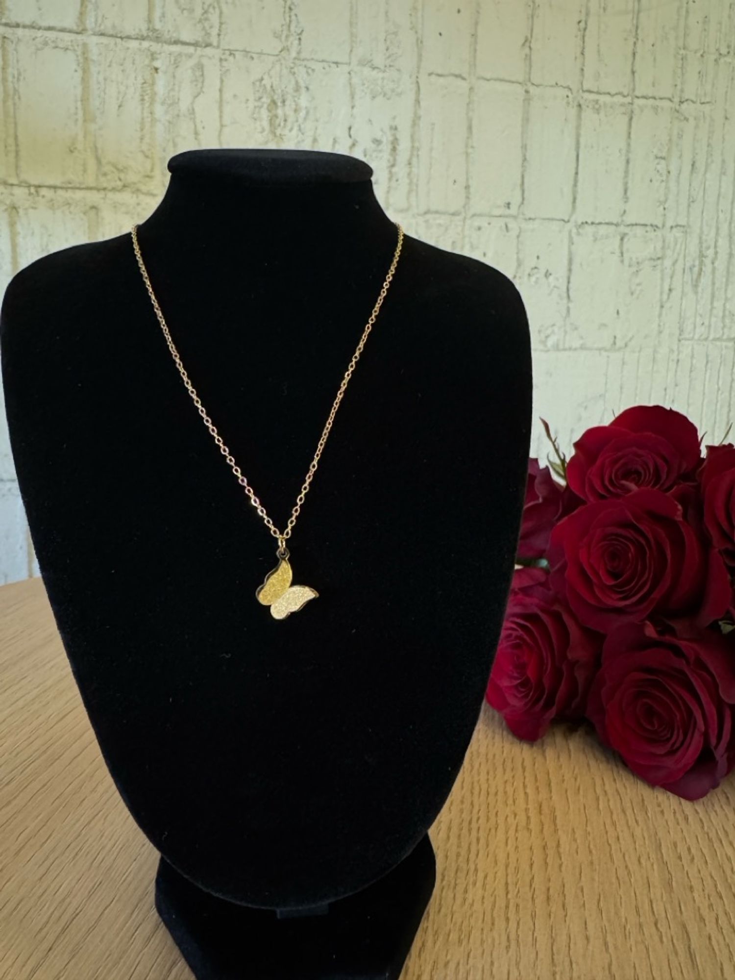 Утга: шинэчлэл, гоо үзэсгэлэн, эрх чөлөө. “Өөрчлөлт, шинэ эхлэл, эрх чөлөөг бэлгэдэн эрвээхэйг бэлэглэж иржээ. Материал: Stainless steel -ган төмрөн хийцийн гоёмсог зүүлт /зэвэрдэггүй, өнгөө алдахгүй/ Өнгө: Алтлаг